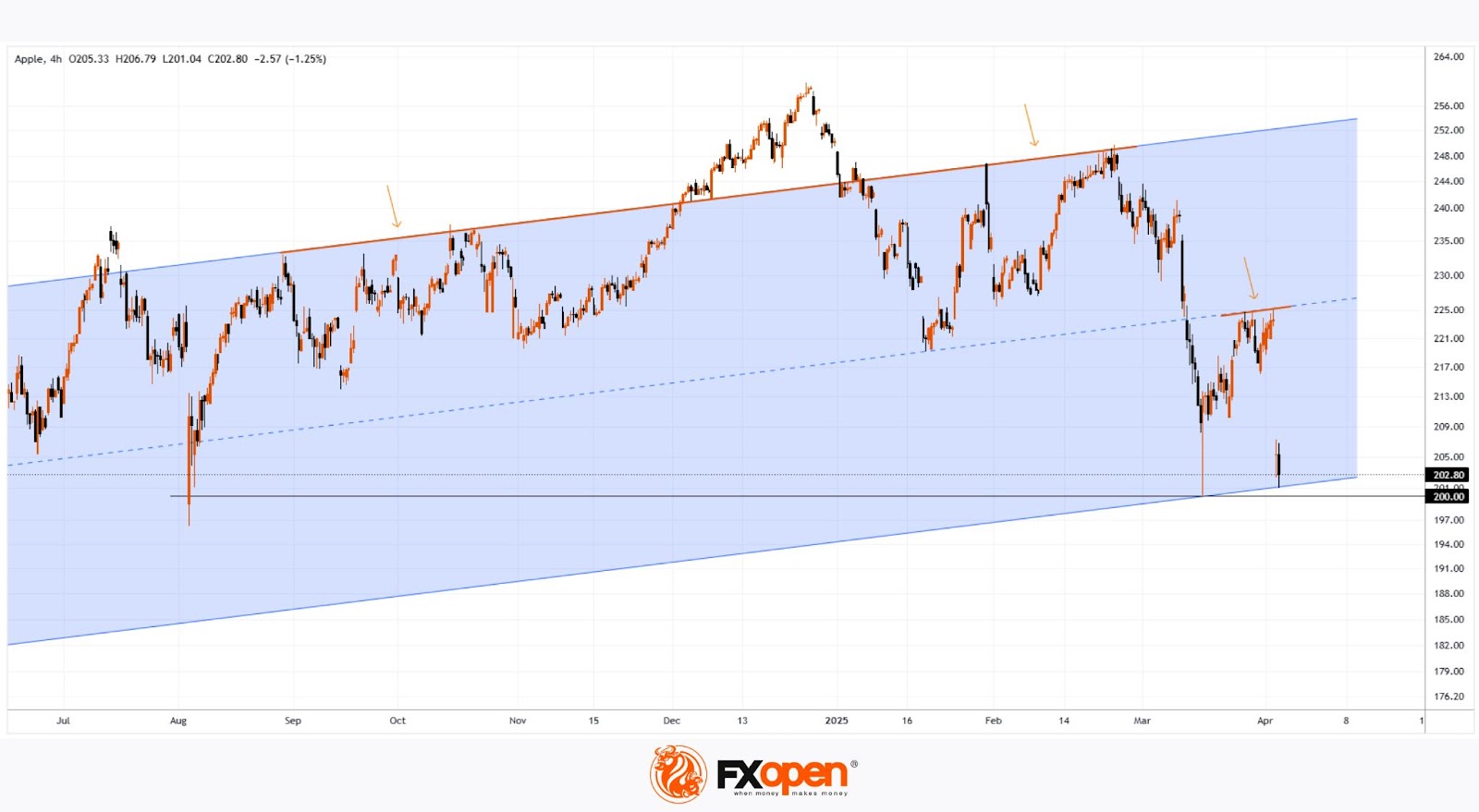 This puts the lower boundary of the trend channel at risk of a bearish breakout. In the coming days, AAPL’s chart may see a bearish assault on the psychological $200 level, which proved significant in August 2024.