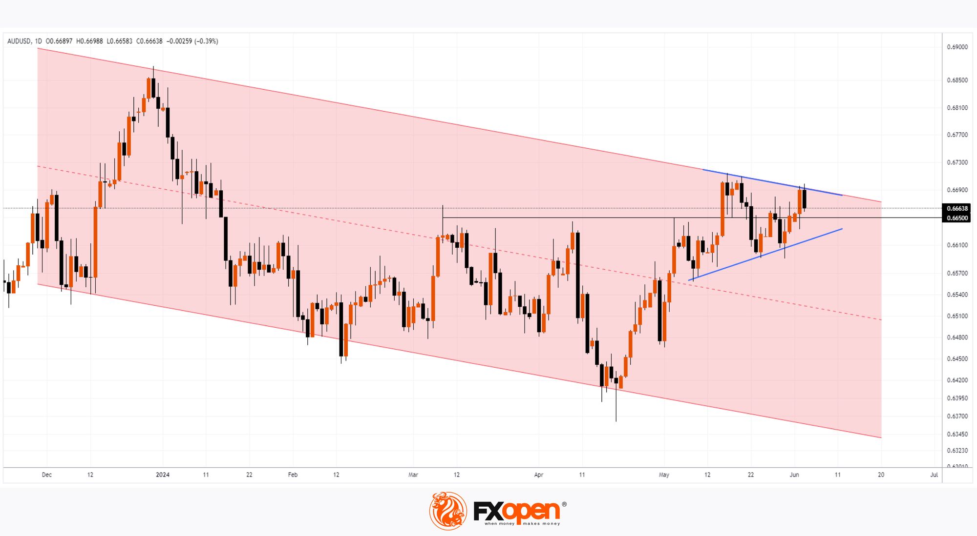It is possible that during June, bears will attempt to break downwards from the consolidation triangle and resume the prevailing downtrend in the AUD/USD market. A key driver for this scenario to unfold will be the FOMC meeting scheduled for June 12th.