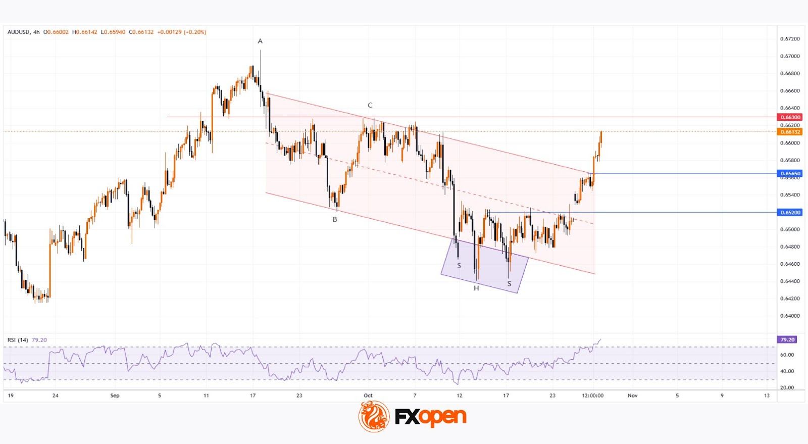Since mid-September, movements in the AUD/USD pair have formed a descending channel (shown in red), built on a series of lower highs and lows starting from point A.