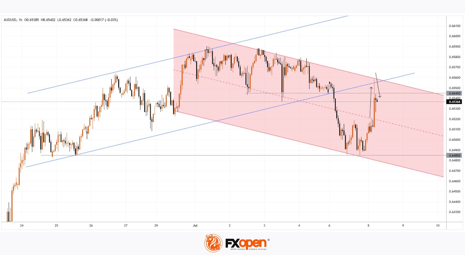 Since early July, price action in AUD/USD has been forming a descending channel (marked in red). In this context: