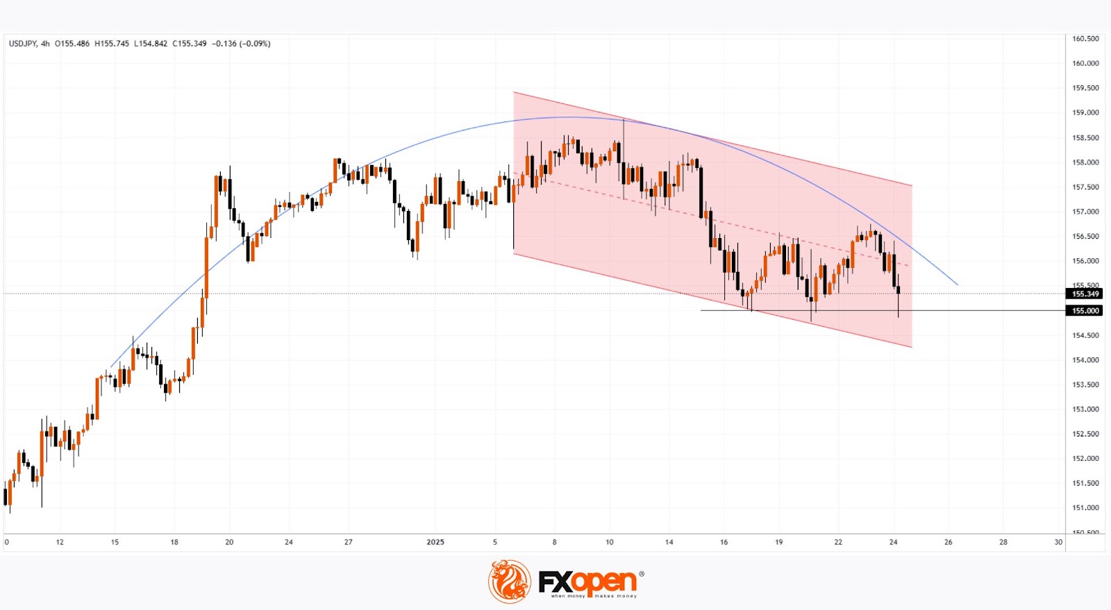 Technical analysis of the USD/JPY chart shows the formation of a descending channel (highlighted in red) at the start of 2025. The news of the rate hike enabled bears to launch another attack on the psychological level of 155 yen per dollar—a level that had previously served as support earlier this month. As of the morning of 24 January, bulls are managing to defend this level, but how long can they hold out if bearish pressure persists?