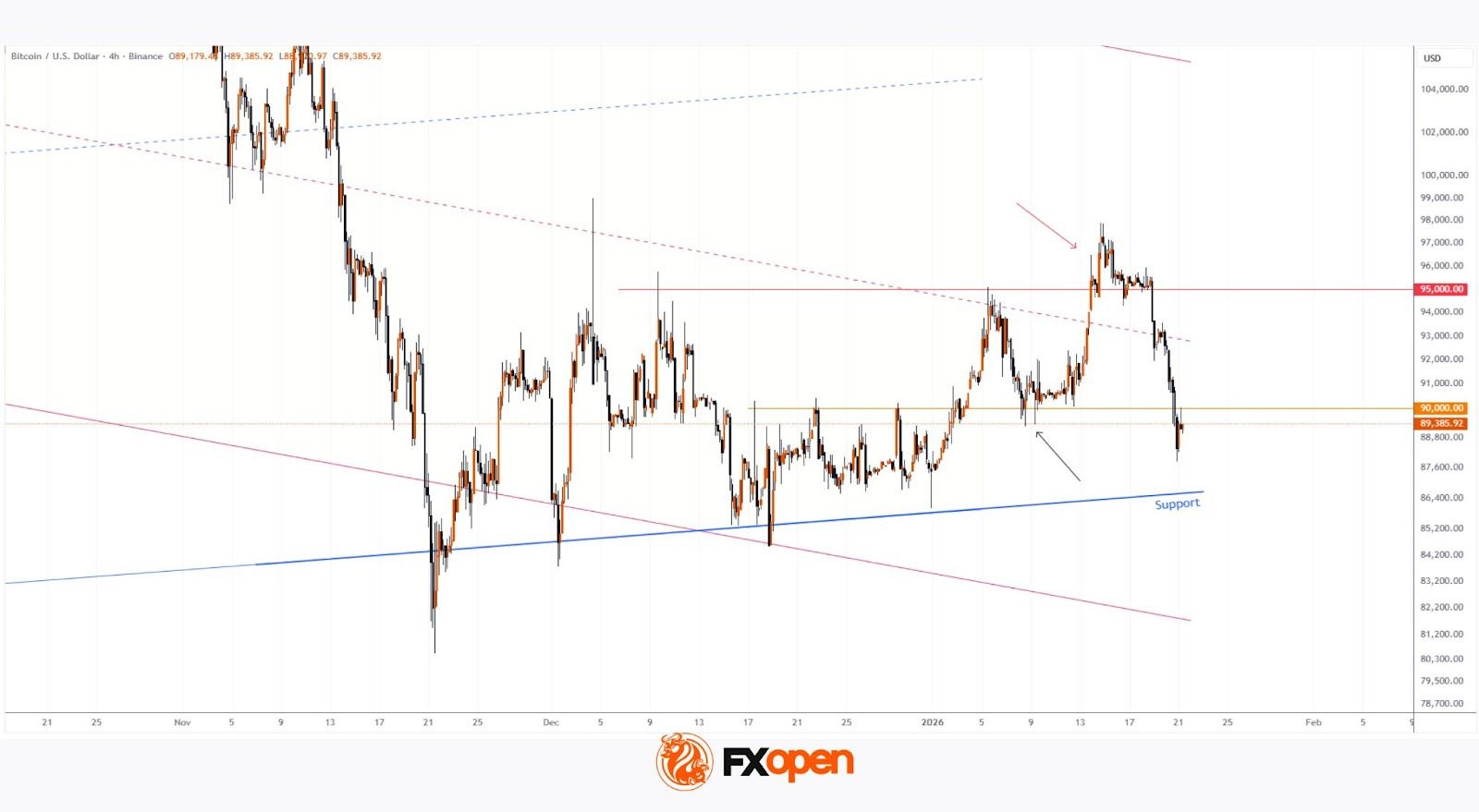 On 8 January, we discussed bitcoin’s price action within a system of two channels, both of which remain relevant. At the time, we noted that a sharp rebound from the $90k level (marked by a black arrow) signalled renewed bullish activity.