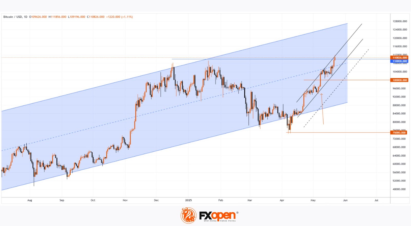 As indicated by the arrow, the break above $100K was strong — marked by a wide bullish candle that closed at its high — after which the bulls continued to push BTC/USD higher. This has resulted in the formation of a new ascending channel (shown in black).