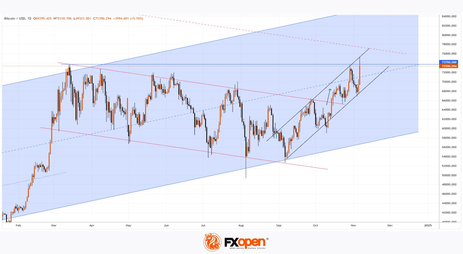 Should Bitcoin’s new historical peak, along with Trump’s potential cryptocurrency support, attract more buyers, the price may continue its rise.