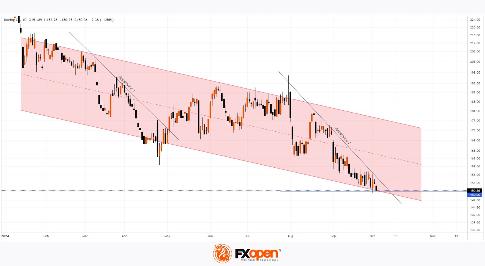 Otherwise, a drop below $150 would indicate intensified bearish pressure and underline Boeing’s fundamental challenges.