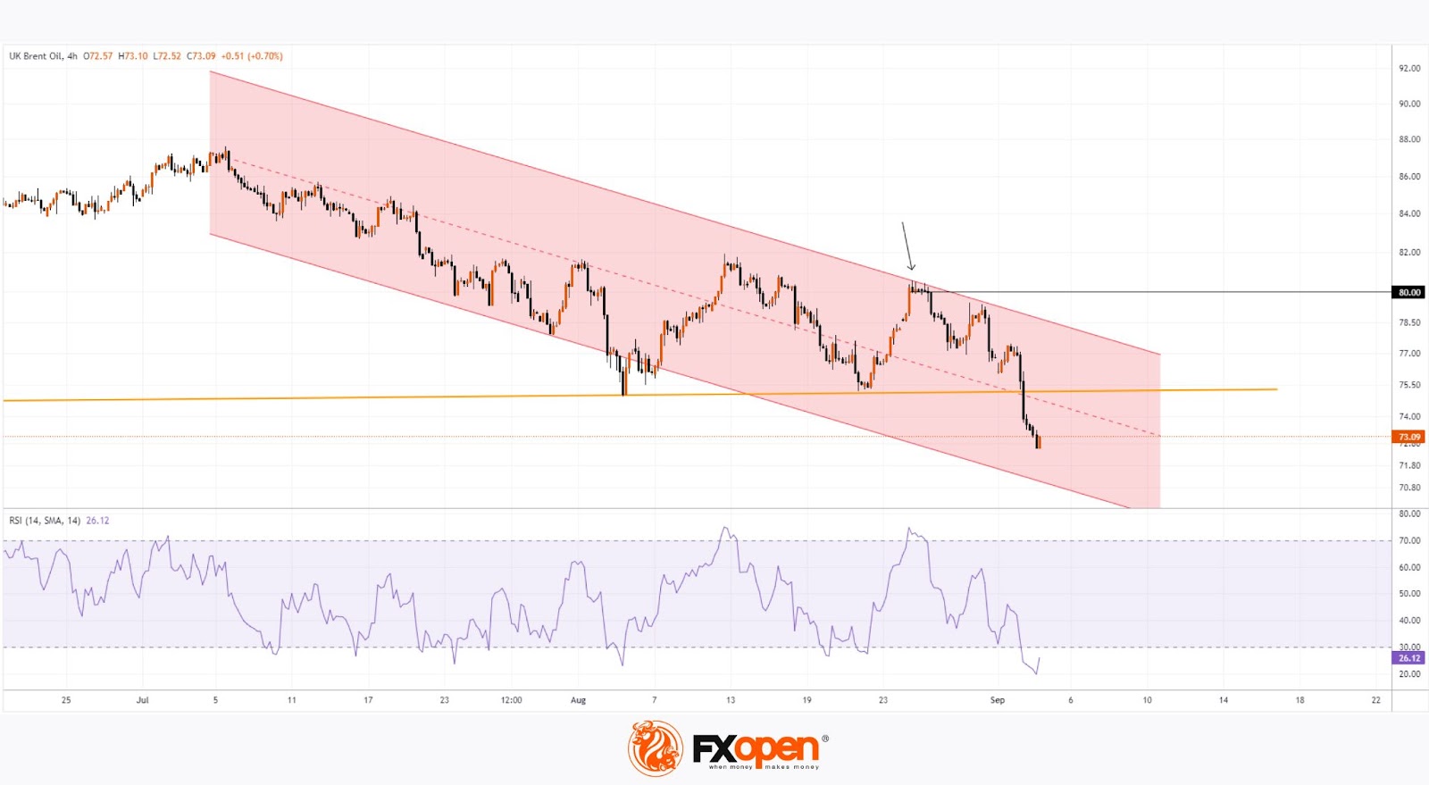 In the worst-case scenario, Brent crude oil could drop to the lower boundary of the channel, approaching the psychological level of $70.
