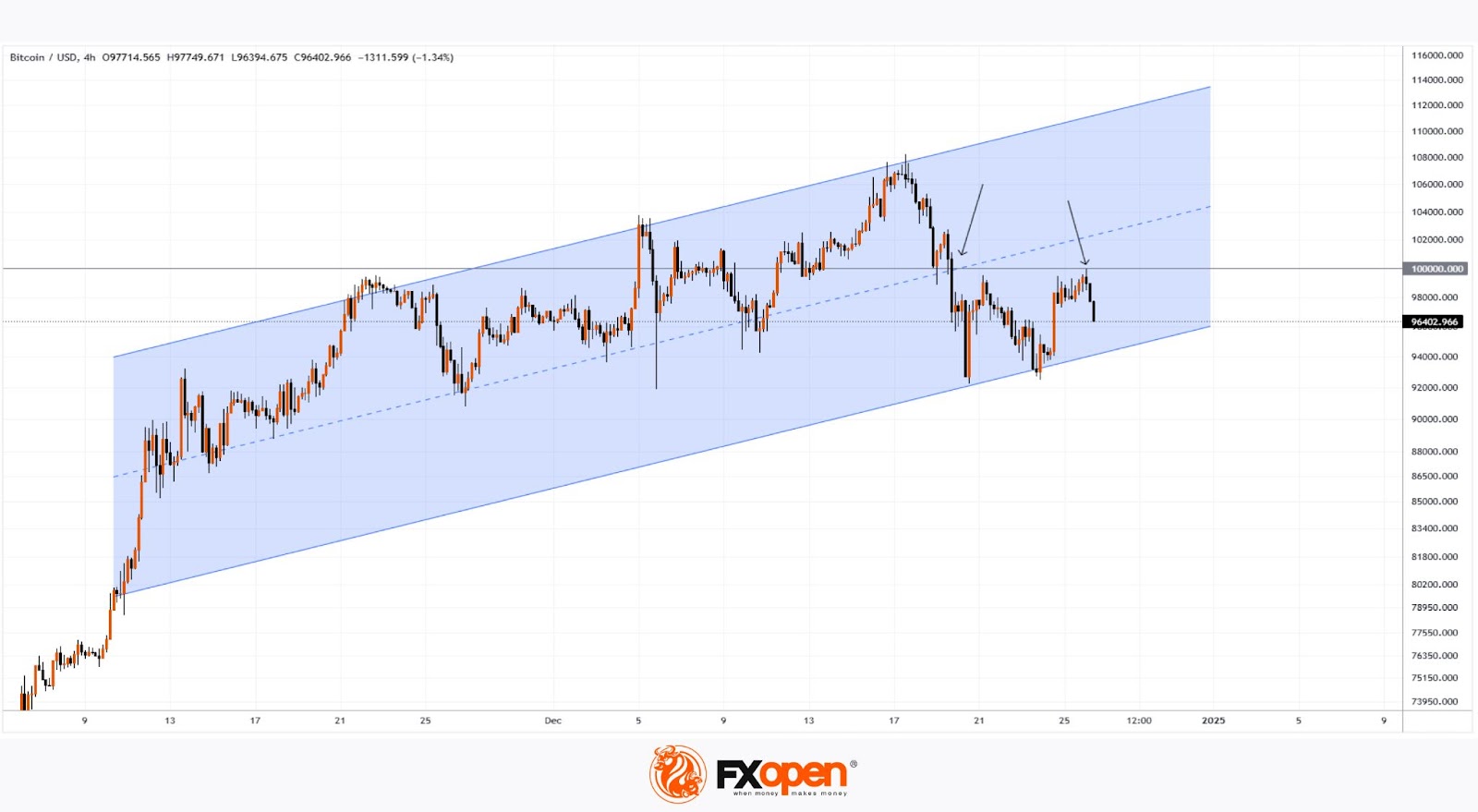 In the short term, Bitcoin faces challenges. According to the BTC/USD chart today, the price dropped below $96,000 after failing to stay above the key psychological level of $100,000.