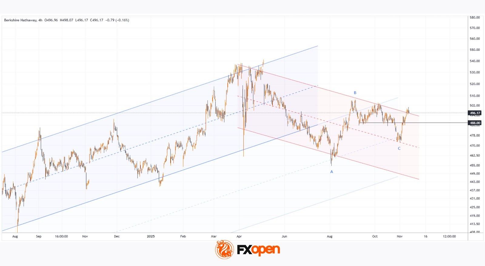 The technical outlook for Berkshire Hathaway’s Class B shares (BRK.B) in 2025 appears mixed. In spring, the stock faced two downward catalysts: