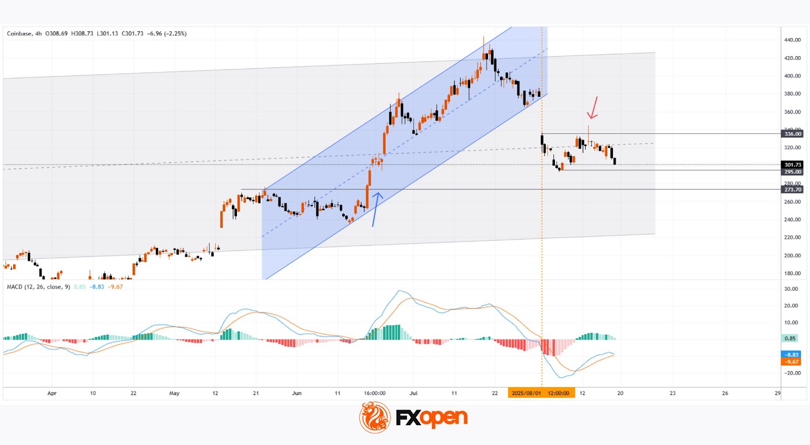 From a broader perspective, the grey channel remains valid. Following the release of a disappointing earnings report on 1 August, COIN formed a bearish gap and found support near the median of this channel.