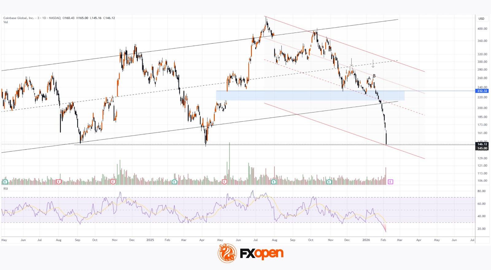 Bitcoin’s drop of more than 50% over five months has had a direct impact on Coinbase (COIN) shares, which slid below $150 for the first time since April 2025.