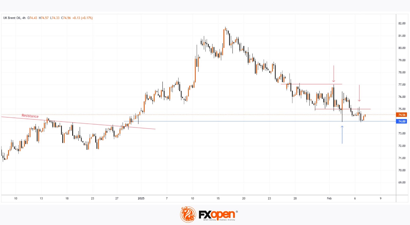 From a technical analysis perspective of the XBR/USD chart, we can see that the price has dropped to a key support level around $75 per barrel. At this level, bulls had the upper hand, managing to break a major resistance line at the end of 2024. It is possible that bulls remain strong in this price range, and the long lower wick on the candlestick—marked with a blue arrow—supports this idea.