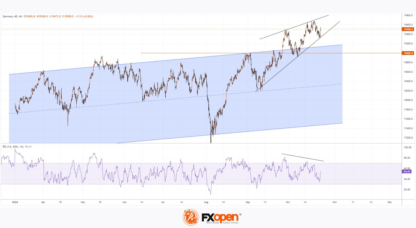 However, the chart for the DAX 40 (Germany 40 mini on FXOpen) shows signs of the upward momentum slowing: