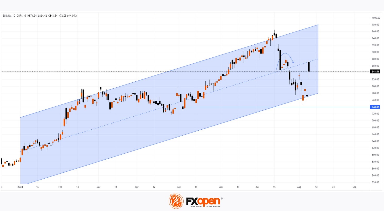 As the chart of Eli Lilly’s (LLY) share price shows today, yesterday’s trading closed at a level more than 9% higher than Wednesday’s closing price. The main driver of this growth was a strong Q2 report: