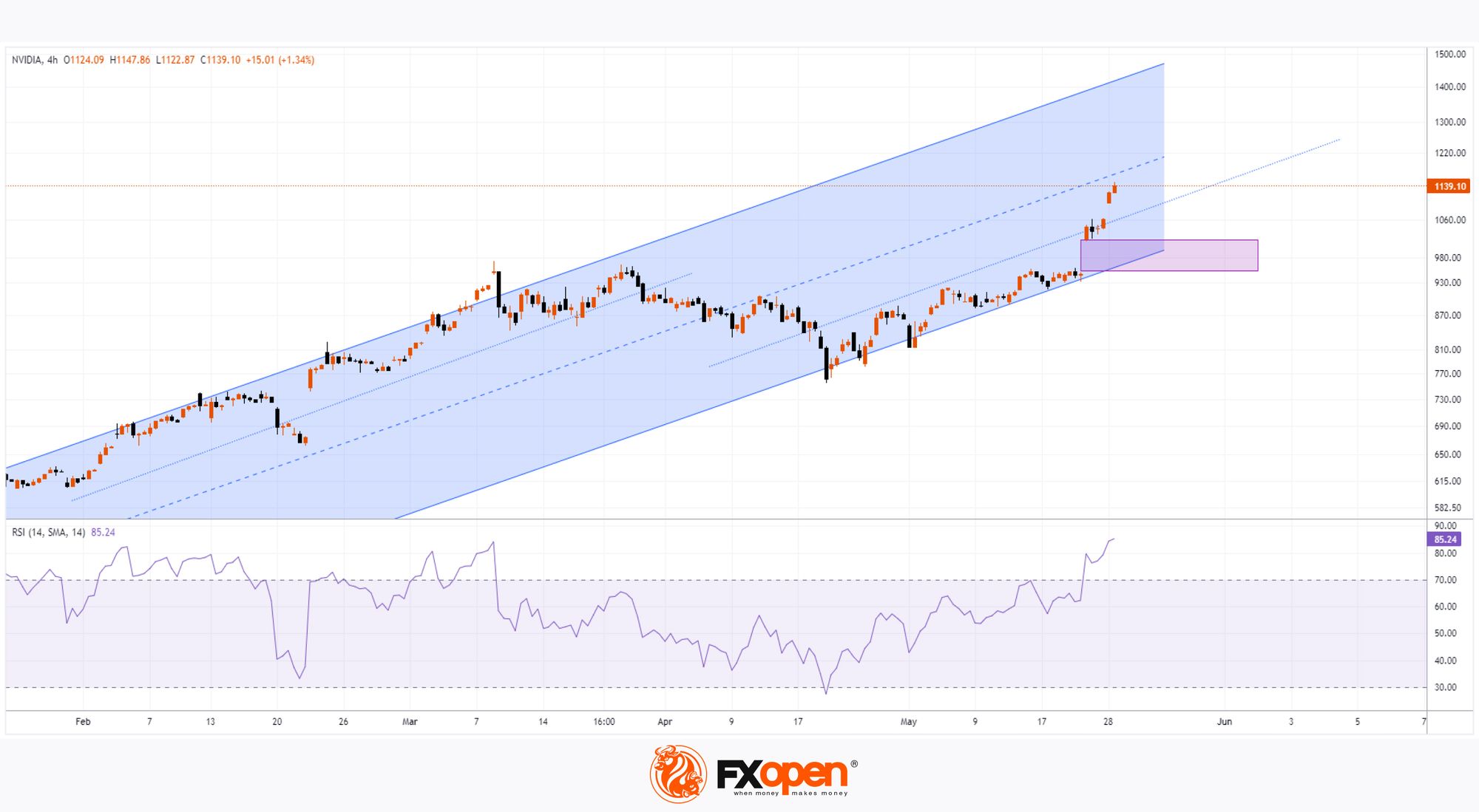 Considering these factors, it is reasonable to assume that the market is excessively overbought and vulnerable to a pullback. A 1:10 stock split scheduled for 10 June could play a role. While Nvidia shares will become more accessible to a broader range of investors (a bullish sign), it is possible that the “buy the rumour, sell the news” principle may apply, and after a series of positive events for NVDA stock, its price may correct towards the lower boundary of the 2024 upward channel and possibly test the gap area (shown in purple).