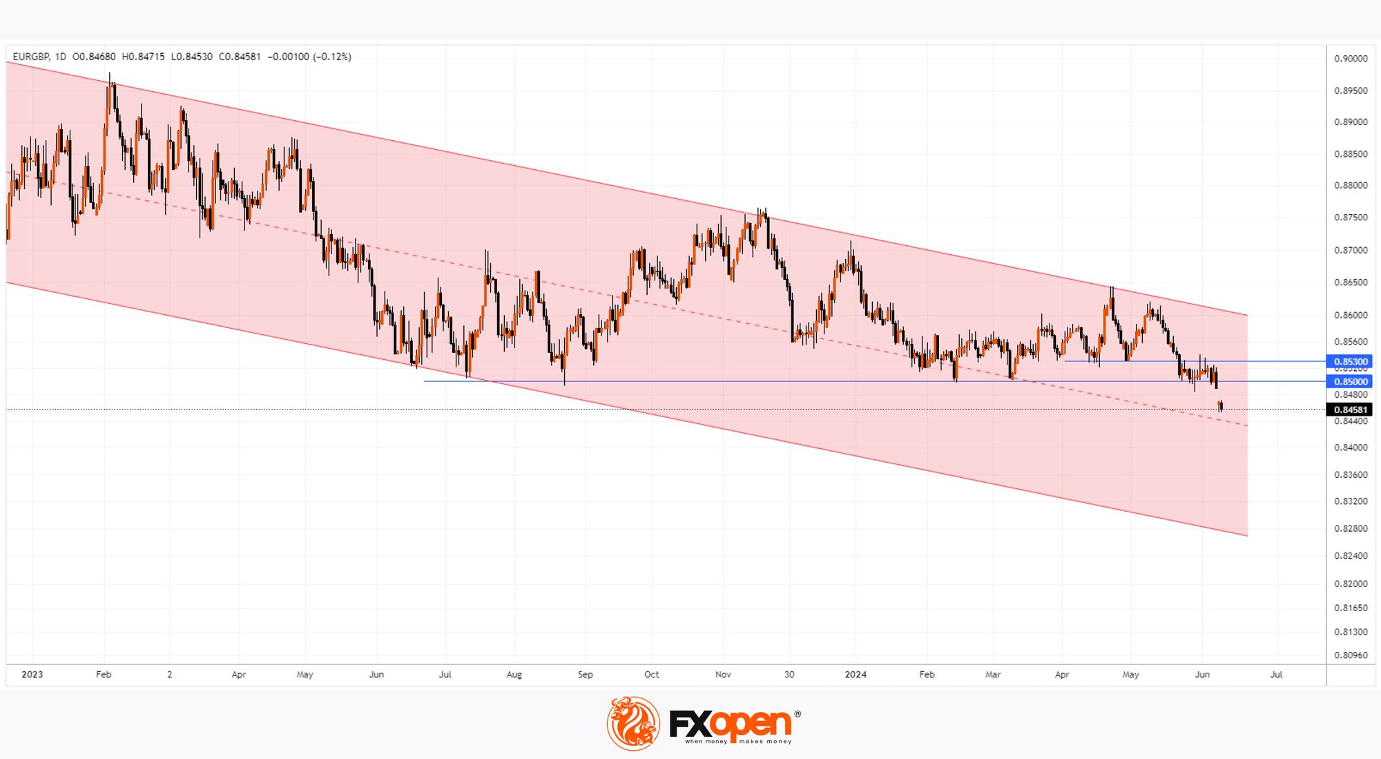 As shown by the EUR/GBP chart, trading on the currency markets opened on Monday around the 0.8465 level—a price not seen since August 2022.