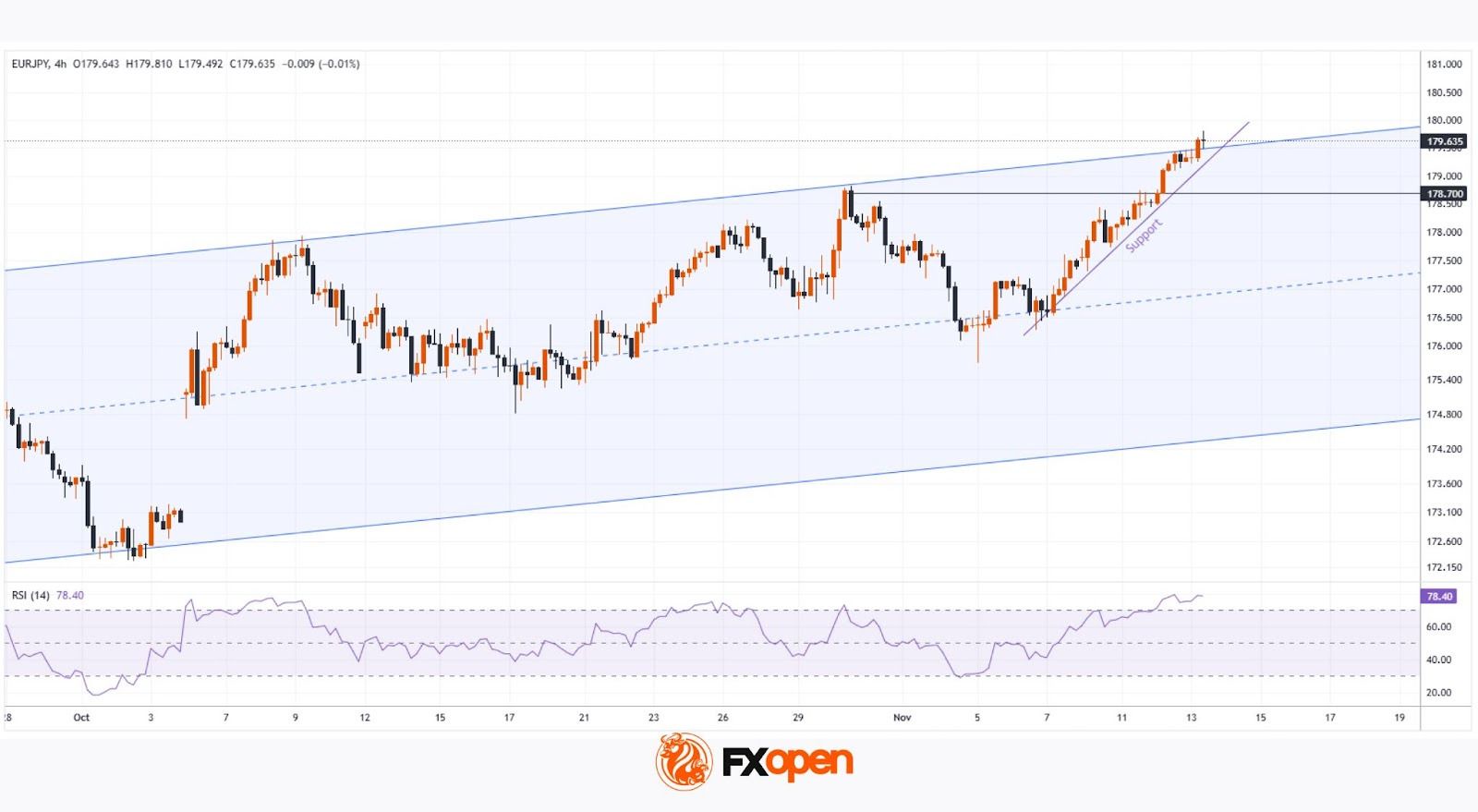 Price action continues to form an ascending channel (marked in blue). Following the early October news of Sanae Takaichi’s victory, who is viewed as a proponent of economic stimulus, the yen weakened, and EUR/JPY moved into the upper half of the channel.