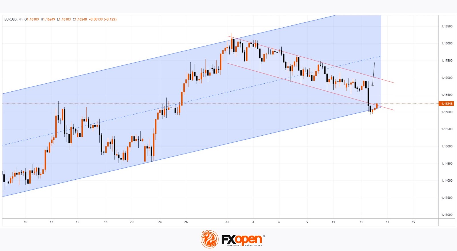 The market responded with a stronger US dollar—indicating that participants believe interest rates are likely to remain at current levels in the near term. Notably, the EUR/USD exchange rate fell to the 1.1600 level for the first time since late June (as indicated by the arrow).