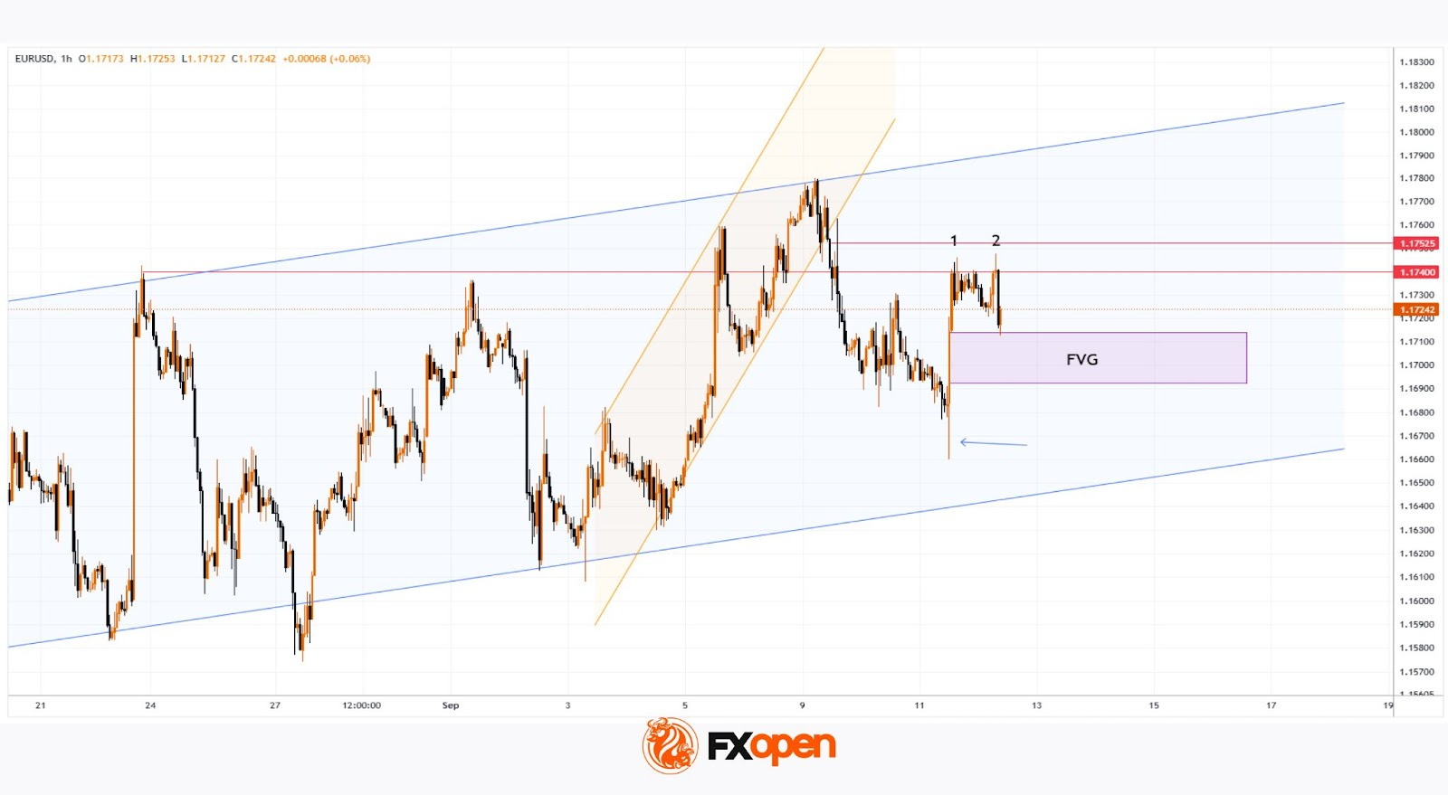 → The steep upward trend from early September (shown in orange) was broken by bears around 1.17525.