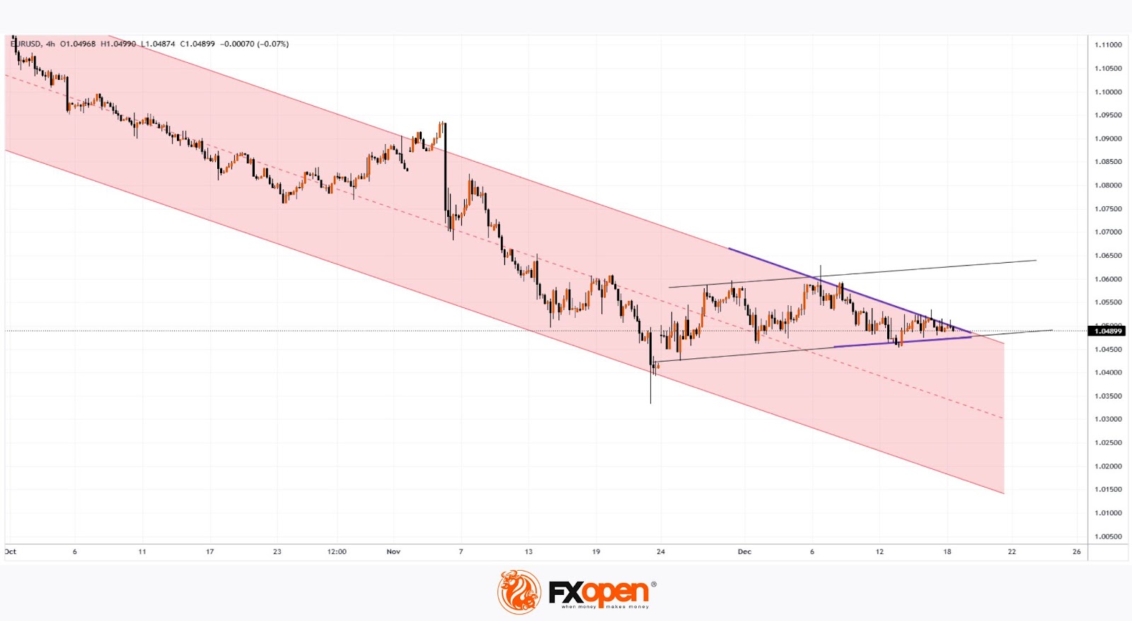 The technical analysis of the EUR/USD chart shows that the pair consolidates between the upper boundary of a descending channel and the lower black support line, forming a narrowing triangle pattern (highlighted in purple).
