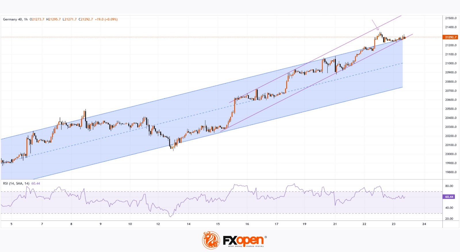 Kukies also remarked that domestic German companies are “under stress” but continue to perform “very well” on the global market, seemingly referencing the rise of the DAX 40 stock index (Germany 40 mini on FXOpen). Indeed, yesterday the index surpassed the 21,300-point level for the first time in history.