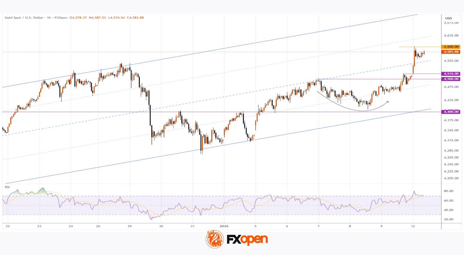At the opening of Monday’s session on 12 January, gold (XAU/USD) gapped higher and briefly moved above the psychological $4,600 level, setting a new all-time high.