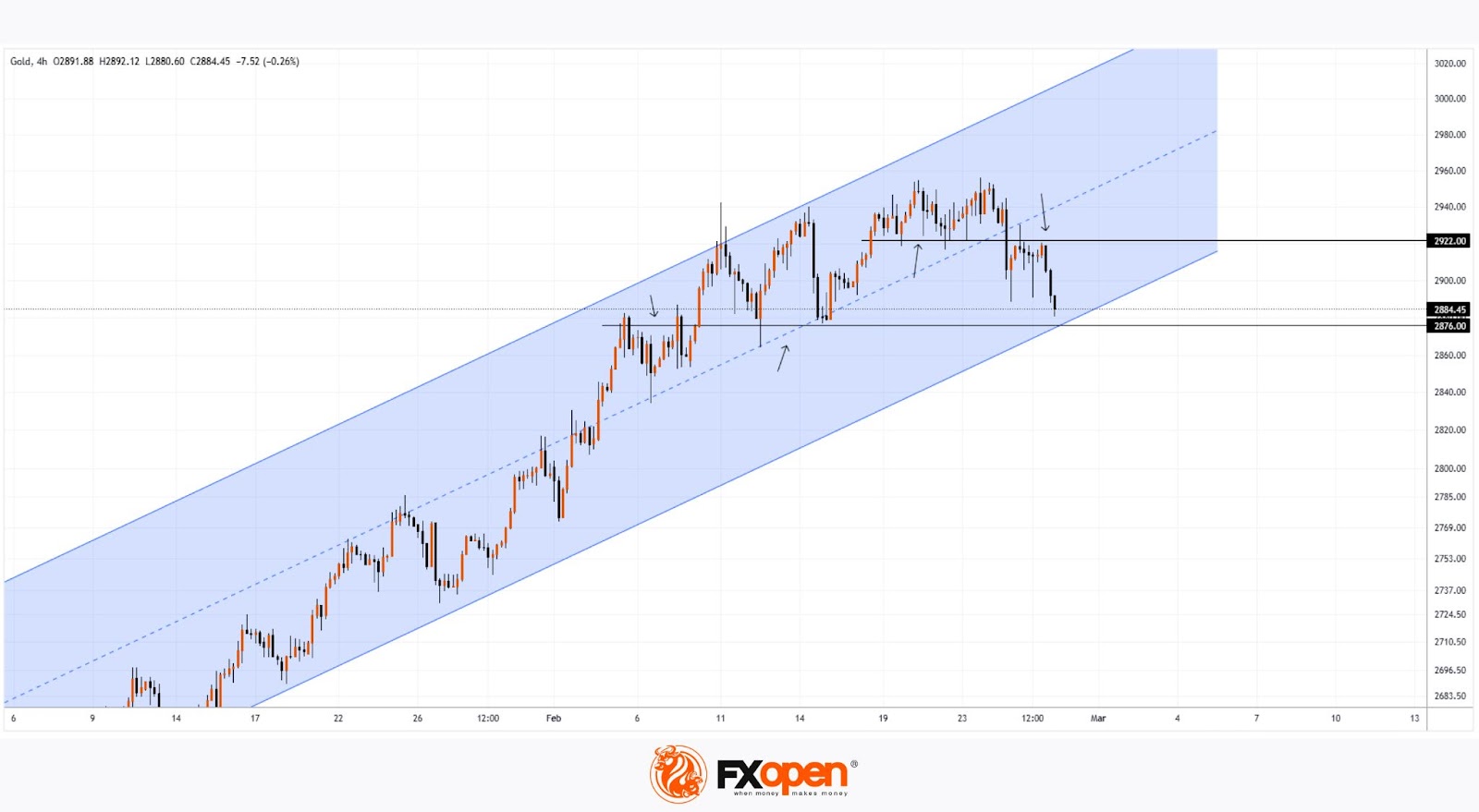 Given these factors, the intersection of the lower boundary of the blue channel and the $2,876 support level could trigger a rebound, offsetting some of the bearish momentum seen so far.