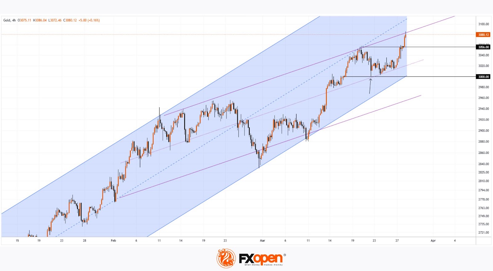 As illustrated on the XAU/USD chart, the price briefly dipped below $3,000 before rebounding swiftly. Based on the Smart Money Concept methodology, this could have been a liquidity sweep triggered by stop-loss orders positioned below the psychological threshold. Regardless, the test took place (as shown by the arrow), and the bullish momentum continued. Gold has now set a fresh record high at around $3,080, with the potential for further gains today.