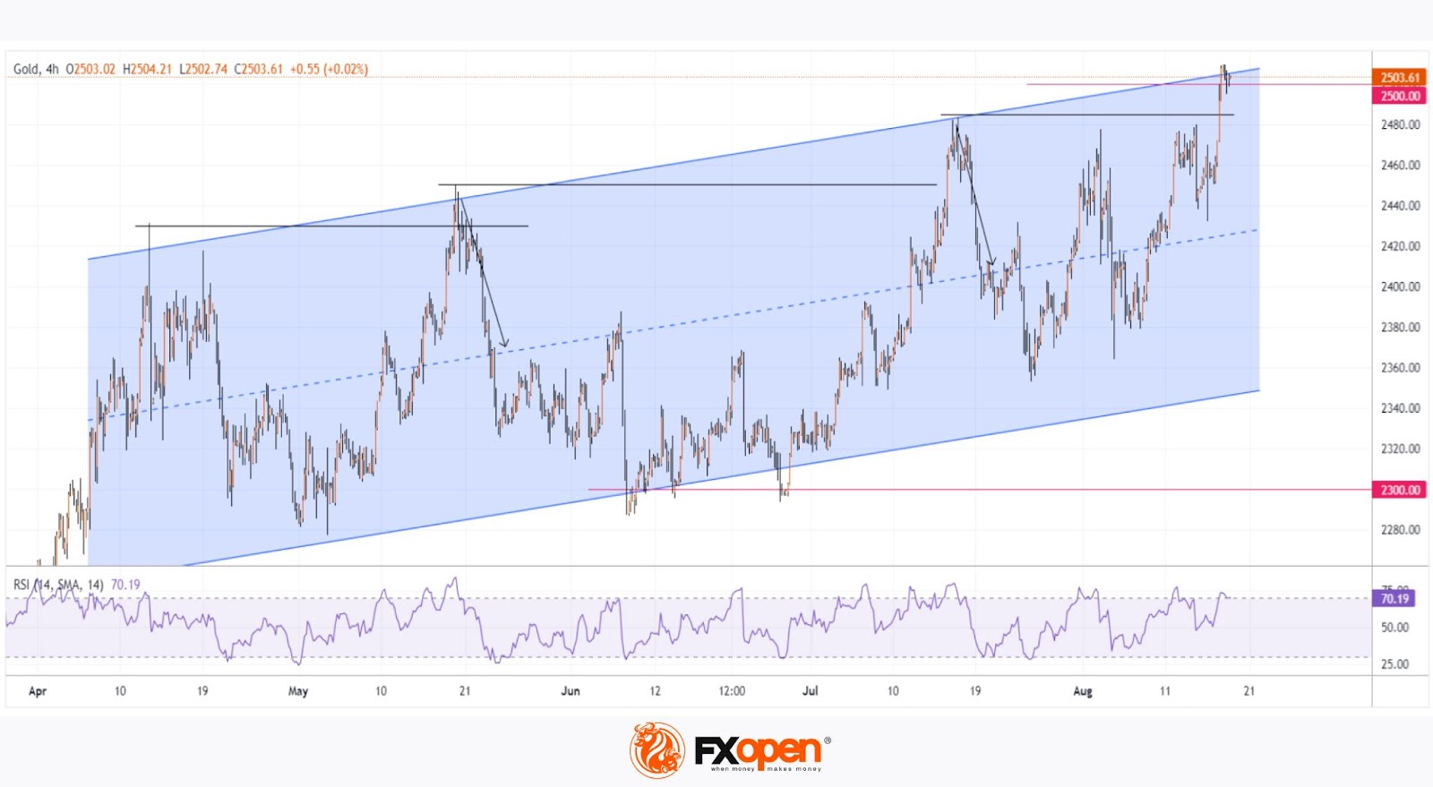 As today’s XAU/USD chart shows, the gold price has risen above the psychological level of $2500. This was influenced by last week’s news, indicating that market participants expect the Federal Reserve to cut rates as early as September. Notably, important signals regarding U.S. monetary policy may be given later this week at the annual economic symposium in Jackson Hole, attended by finance ministers and central bank governors.