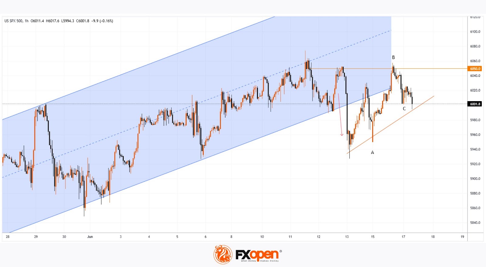 The S&P 500 index (US SPX 500 mini on FXOpen) climbed on Monday (A→B) following reports of potential talks between Iran and the U.S. However, it pulled back (B→C) after the U.S. President urged citizens to evacuate Tehran.