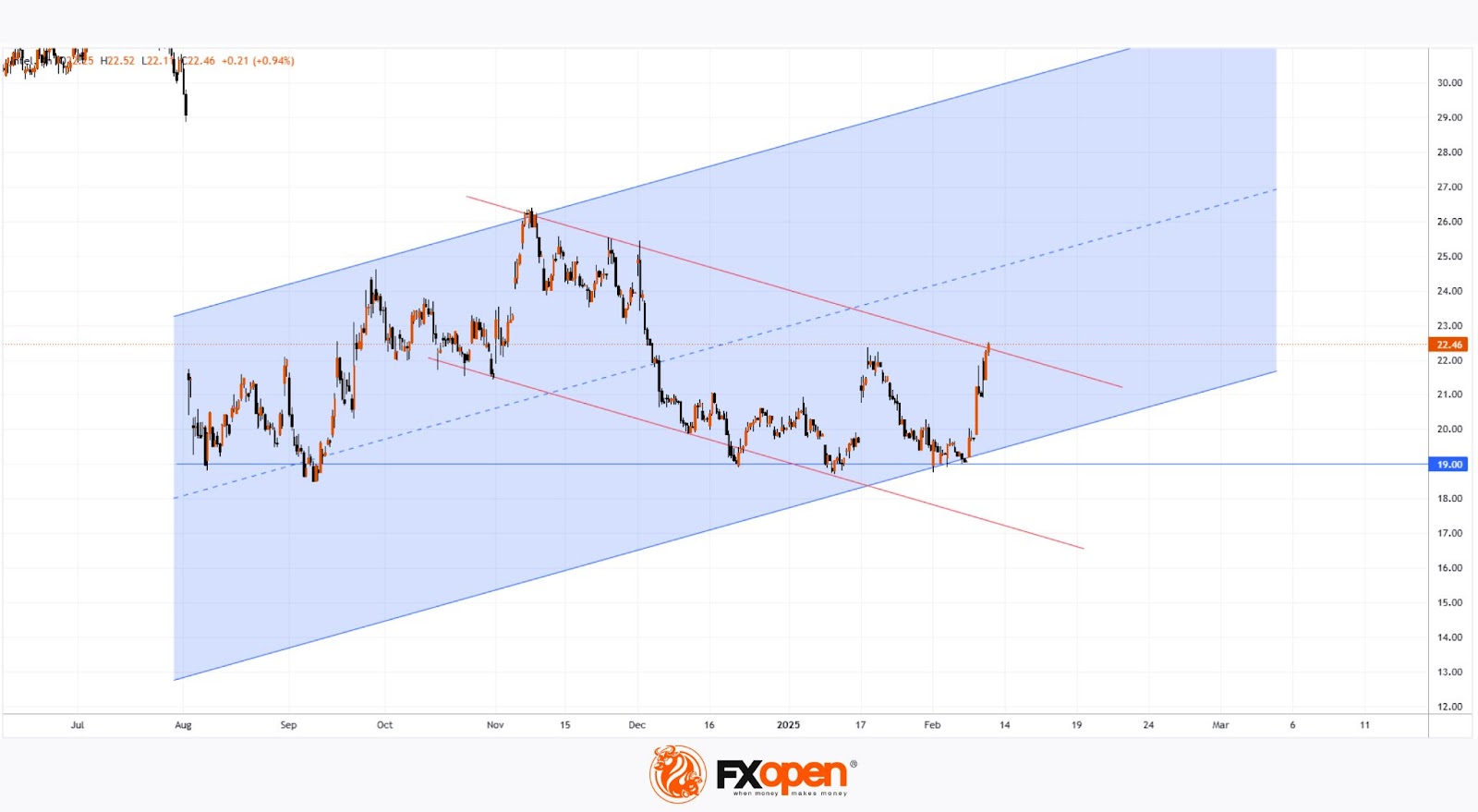 Price fluctuations for INTC outline an ascending channel (marked in blue). While strong demand could drive the stock toward the channel median, the upper red trendline of the broader downtrend may act as resistance—raising the likelihood of a correction following the 17% surge.