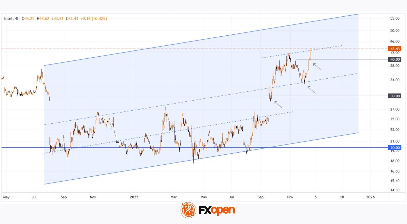 Six months ago, INTC’s chart showed $20 as a key support level, backed by major investors. Since then, the stock has formed an ascending channel (shown in blue), which was extended upwards in September.