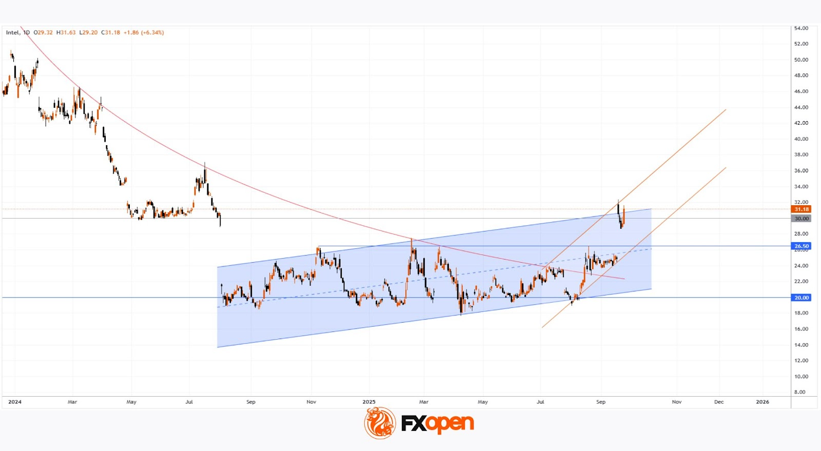 → On 18 September 2025, Nvidia officially announced a $5 billion investment in Intel and the launch of a multi-year strategic partnership. This came as a shock to the market: instead of competing, the two giants decided to join forces in developing new products. INTC shares gapped strongly higher, surpassing the psychological $30 mark for the first time this year.