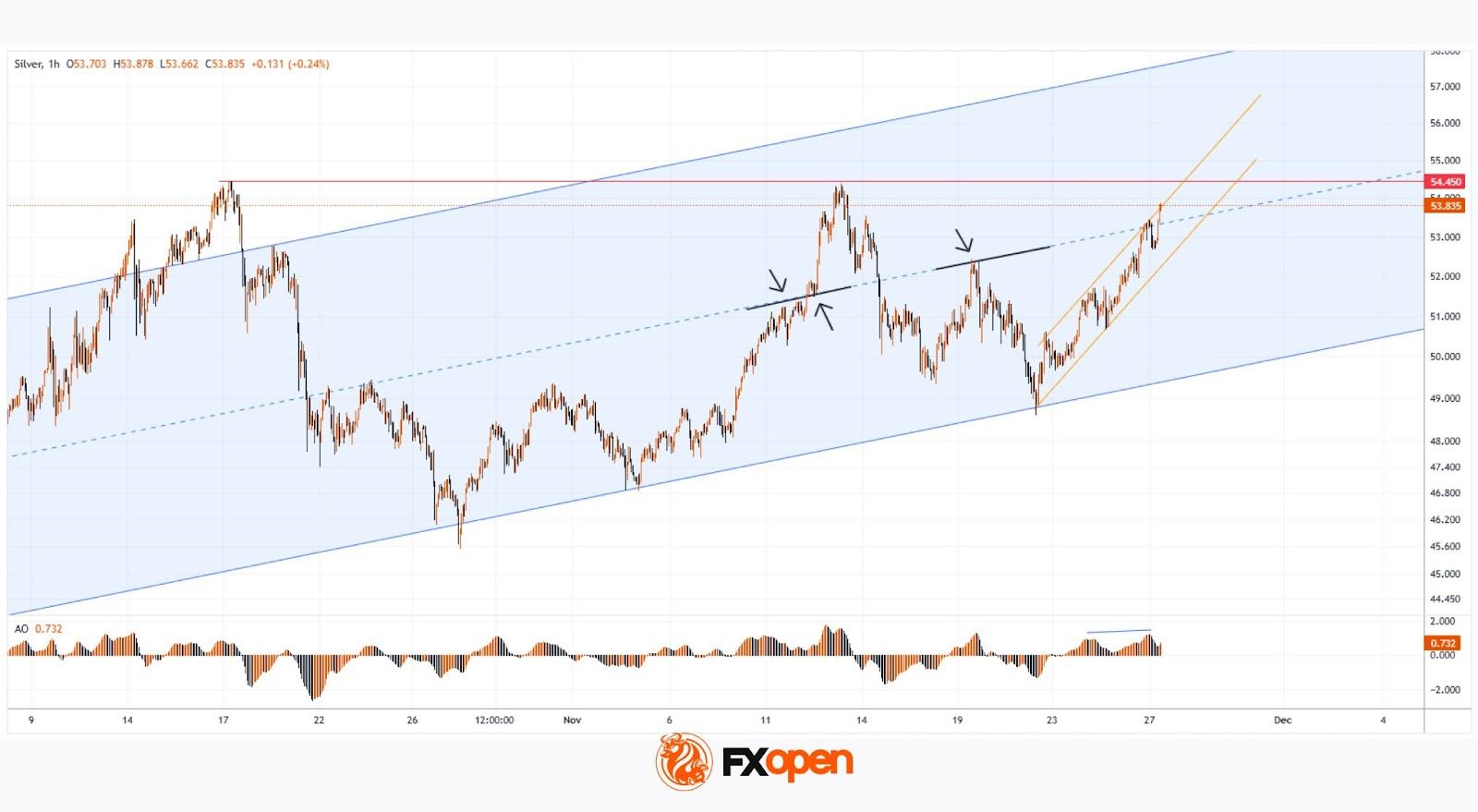 Examining the XAG/USD chart, we can identify key swing points that allow us to outline an ascending channel. This week’s strong advance has pushed silver into the upper half of that channel.