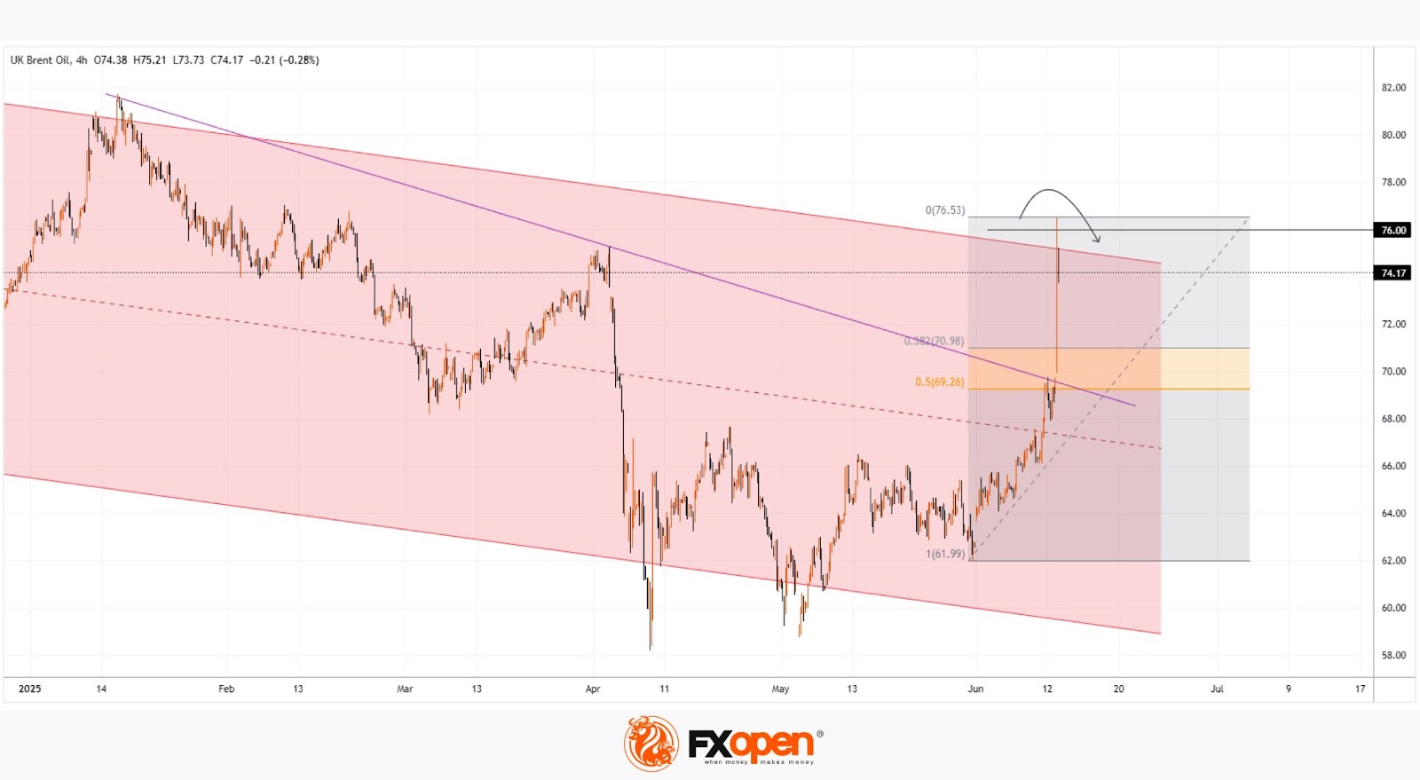 Brent crude oil price has risen to the upper boundary of a large-scale descending channel (shown in red), which is defined by lower highs from 2024–2025. As anticipated, this upper boundary acted as resistance, with the price forming a peak above $76 before reversing downward (as illustrated by the black arrow).