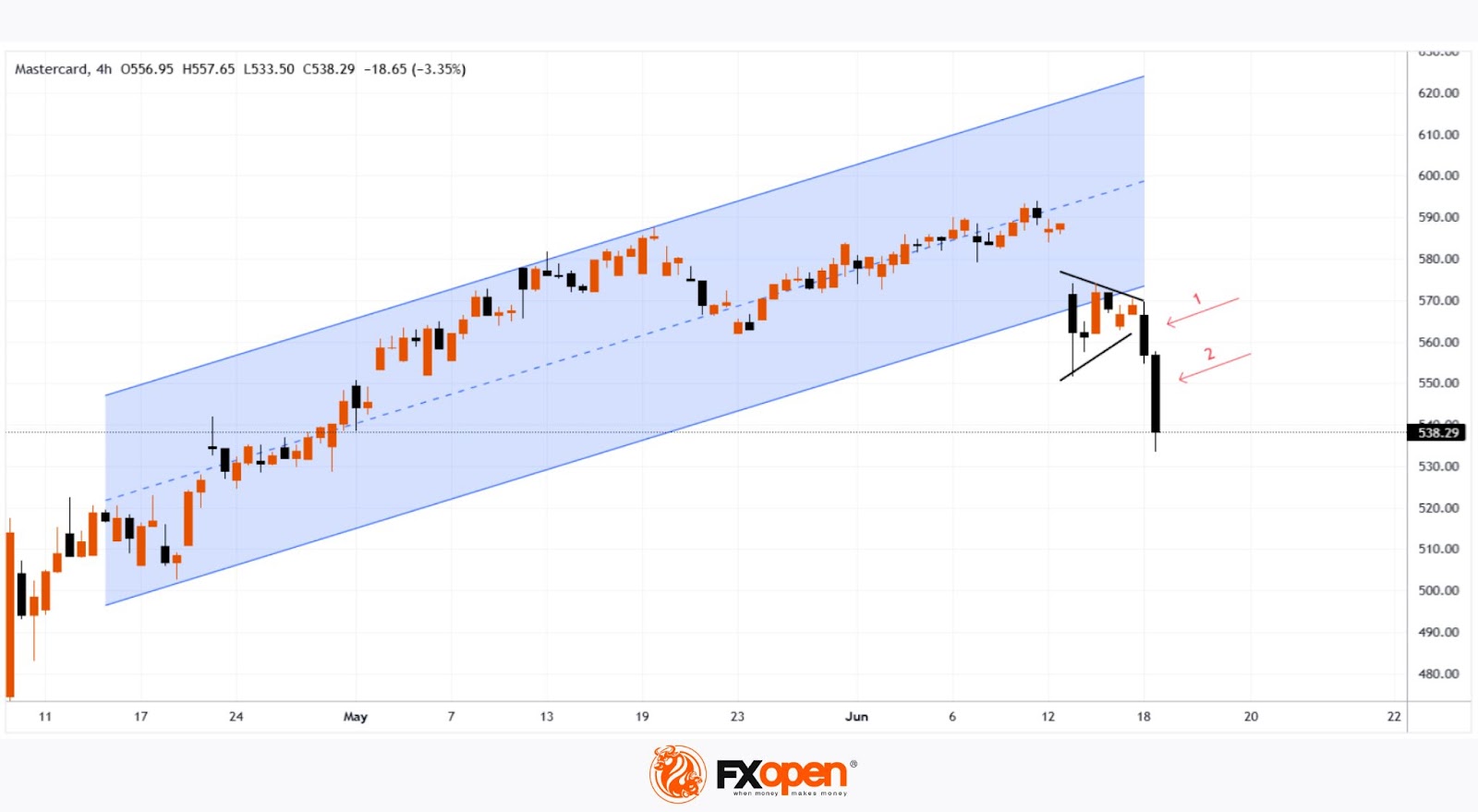 In May, MA shares formed an upward trend (shown in blue), but this was already broken by a strong downward move, accompanied by a wide bearish gap in the $575–$585 range.
