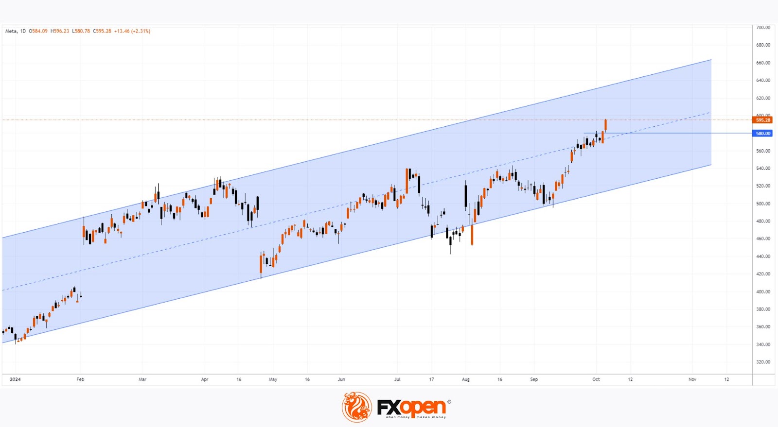 Since then, Meta Platforms’ stock has maintained its upward trend, reaching new all-time highs. The price has surpassed $595 and is now nearing the psychological $600 mark.
