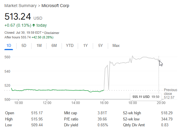 According to available data, MSFT’s post-market price jumped to $555 per share, exceeding its previous all-time high by more than 8%.