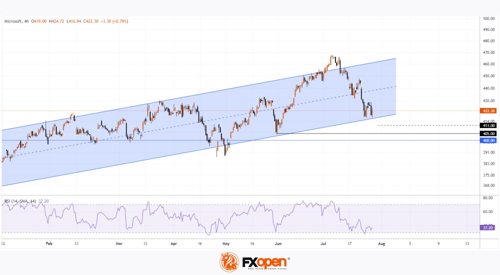 If the sharp decline followed by a strong recovery signifies the liquidation of speculators (likely given the approximately 24% rise from the start of the year to mid-July), then MSFT’s price could return to the blue channel and resume growth within it (channel boundaries might need adjustment).