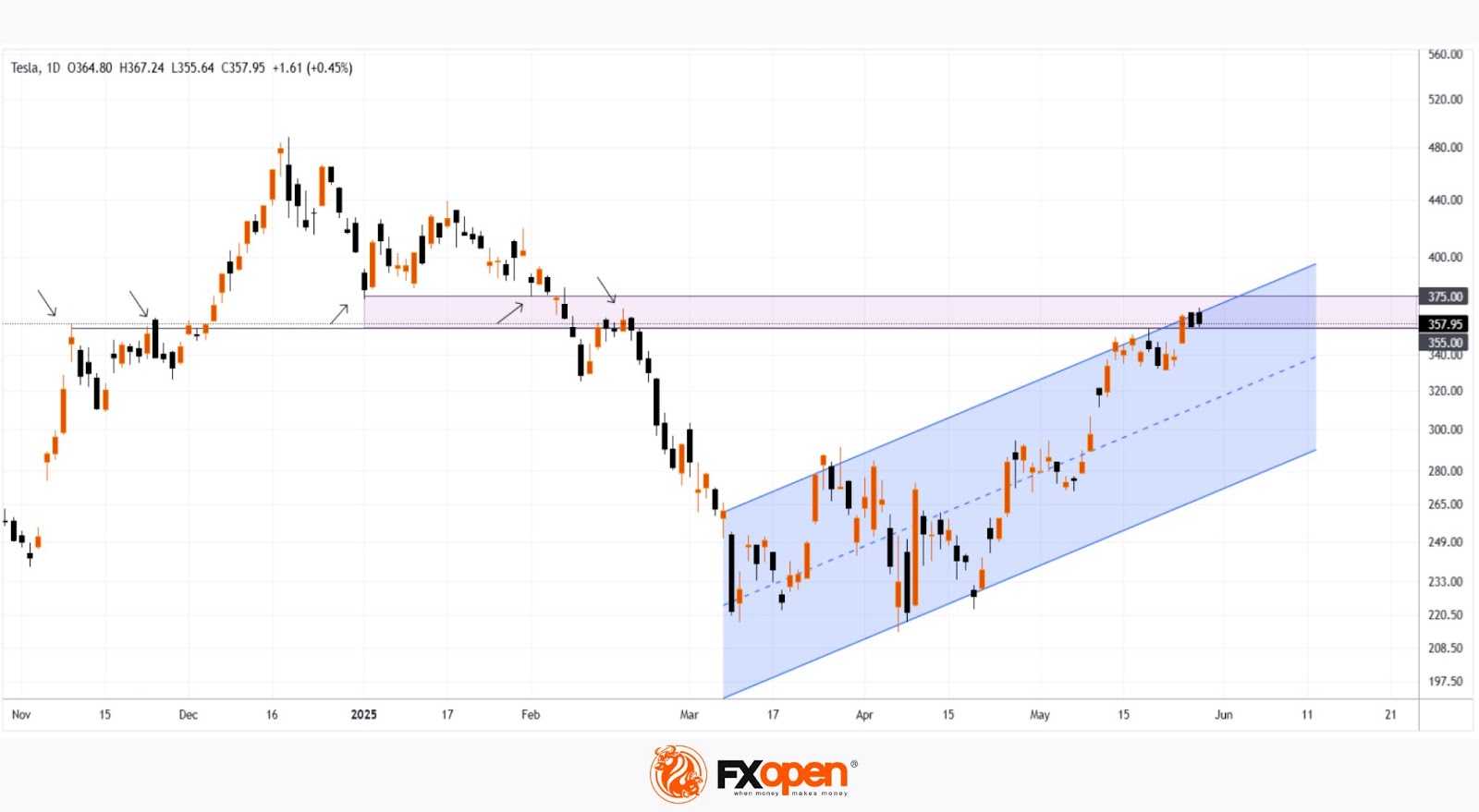 During yesterday’s main trading session, TSLA stock surged to $367—its highest level since mid-February.
