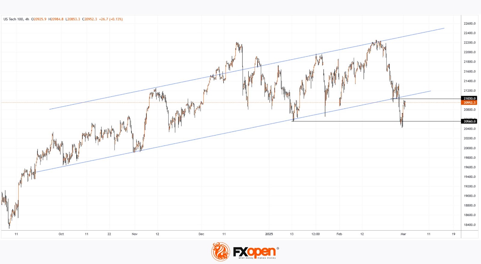 The market’s next move could depend on how Nasdaq 100 (US Tech 100 mini on FXOpen) behaves around the 21,030 level. Previous rebounds from this support line were weak, and bears managed to break through with effort. This suggests they may still control this zone.