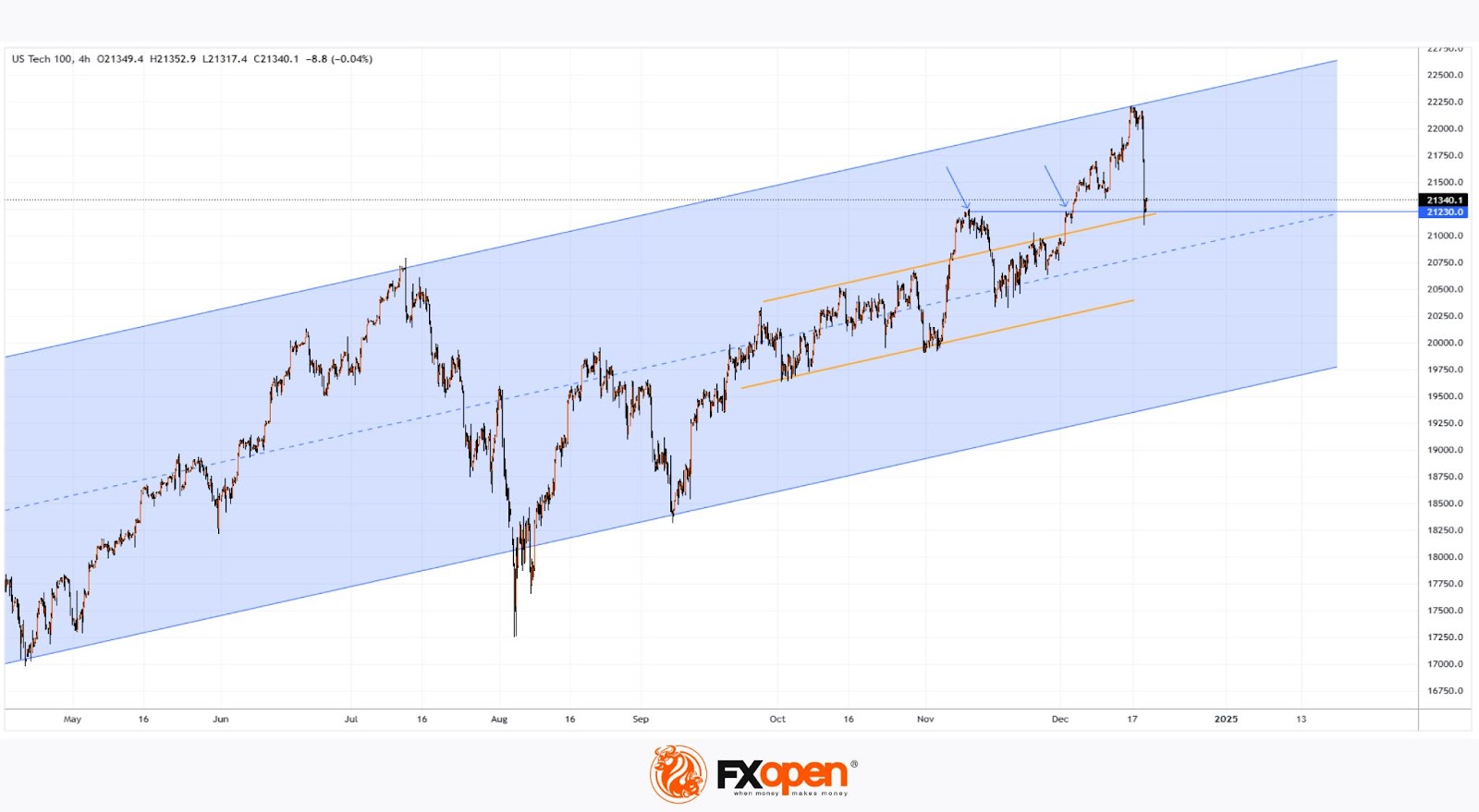 Yesterday, the Fed cut the interest rate by 0.25%. Although it was anticipated, the market reaction was sharply negative. The Nasdaq 100 (US Tech 100 mini on FXOpen) dropped by approximately 4%.