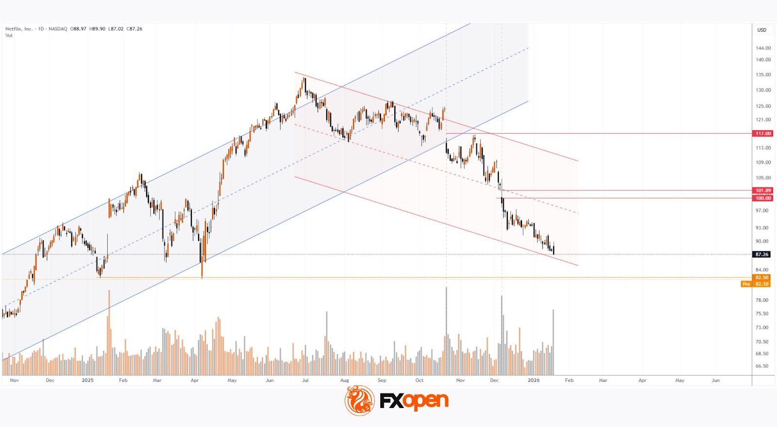 → In December, NFLX shares moved into the lower half of the descending channel, accompanied by rising volumes and accelerating downside momentum — a bearish signal — and settled below the psychological $100 level, which may now act as resistance.
