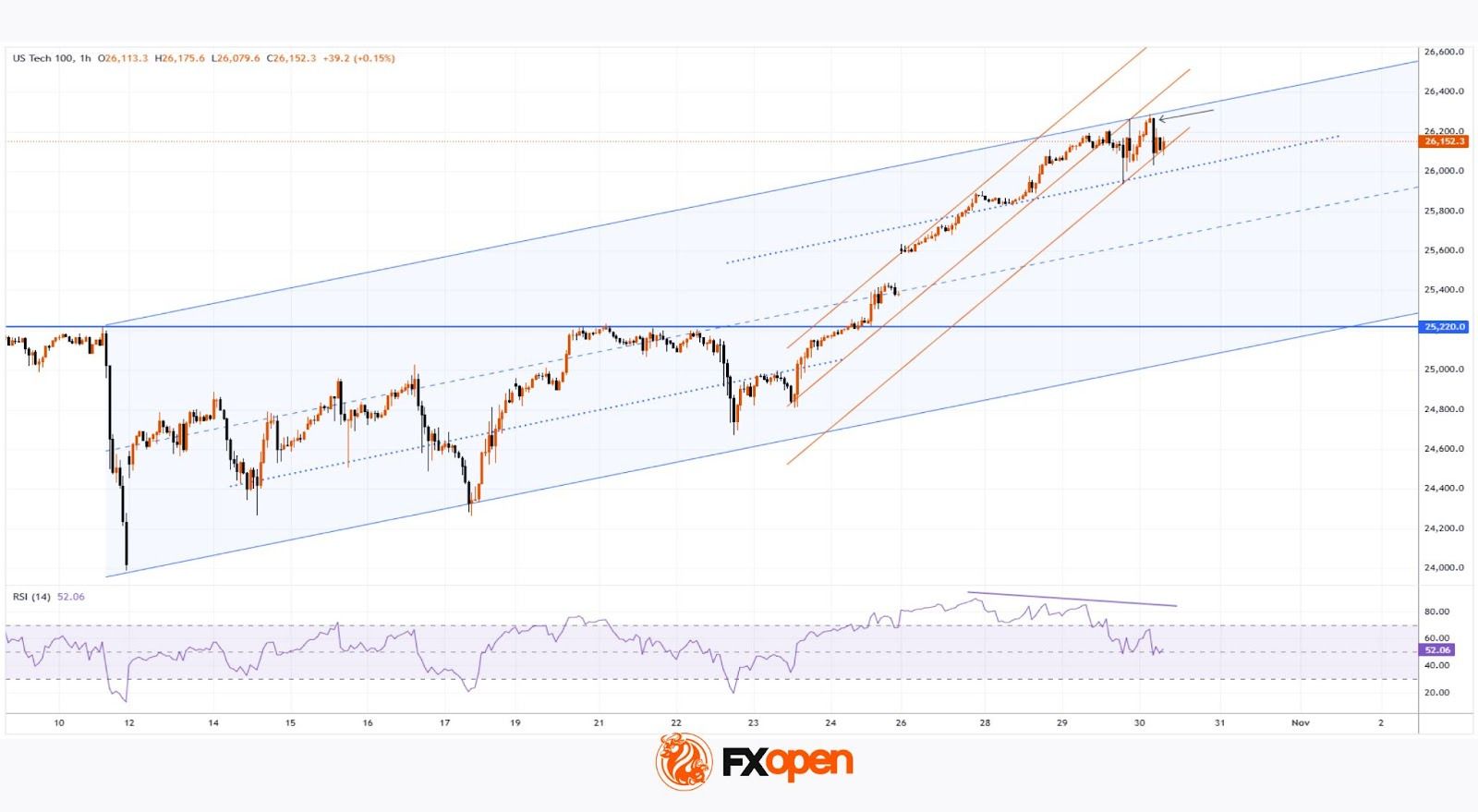 According to the chart, the Nasdaq 100 index (US Tech 100 mini on FXOpen) has climbed above the 26,260 mark for the first time in history. Market sentiment is being driven by an extraordinary combination of powerful news factors: