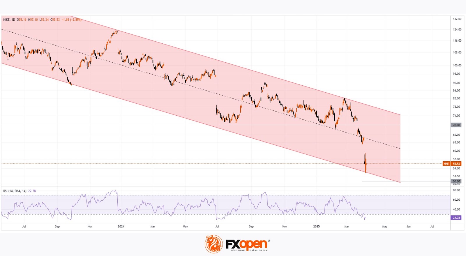As noted in our analysis from September 2024, Nike shares had been trending downward for several months due to intense competition. However, President Trump’s tariffs have become the dominant bearish factor.