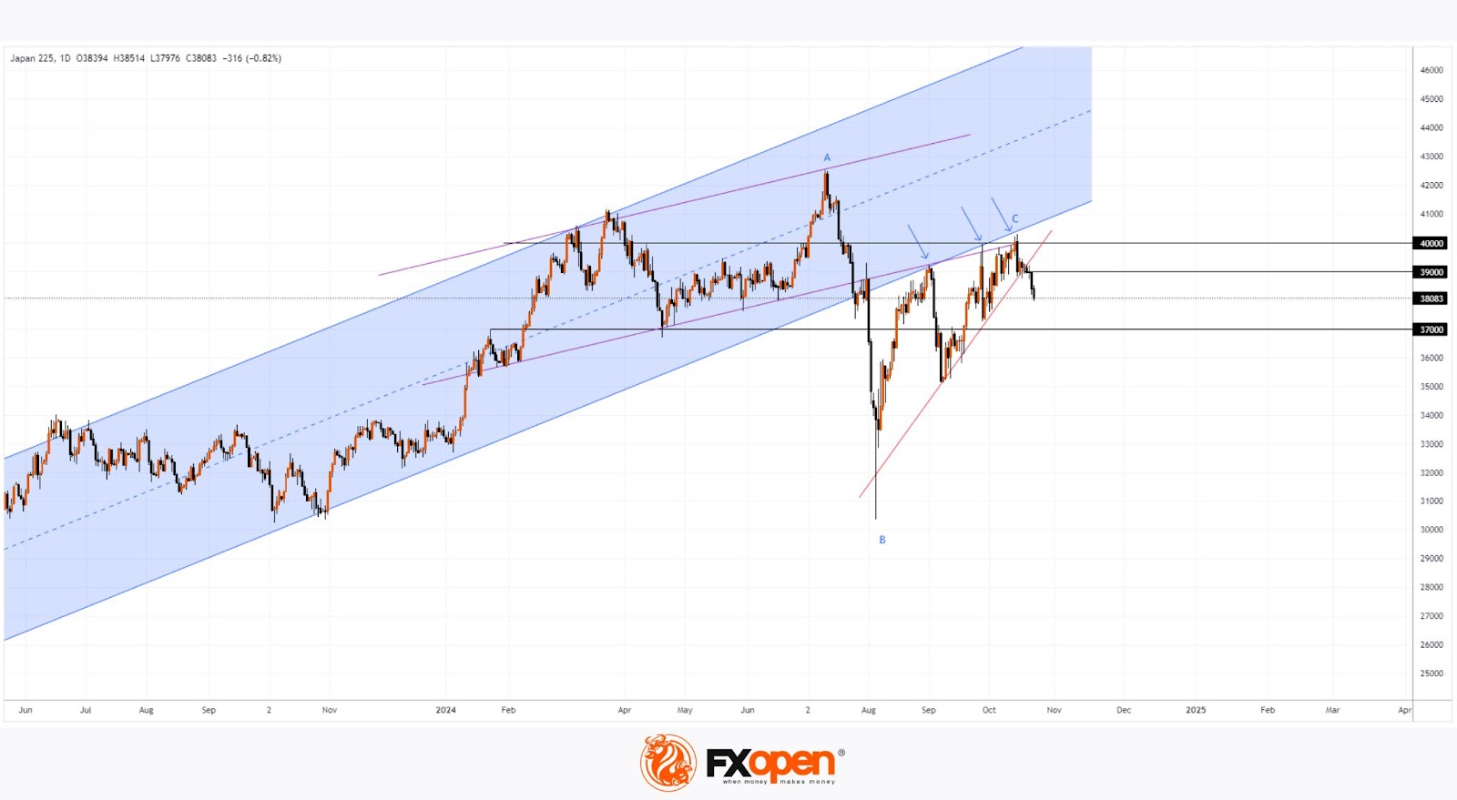 In mid-October, the Nikkei 225 index (Japan 225 on FXOpen) attempted to breach the psychological barrier of 40,000 points but ultimately failed, reversing its course downwards.