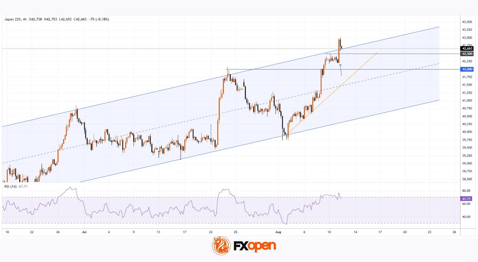 As the chart shows, the Nikkei 225 stock index (Japan 225 on FXOpen) rose today to the 43,000-point level, thereby: