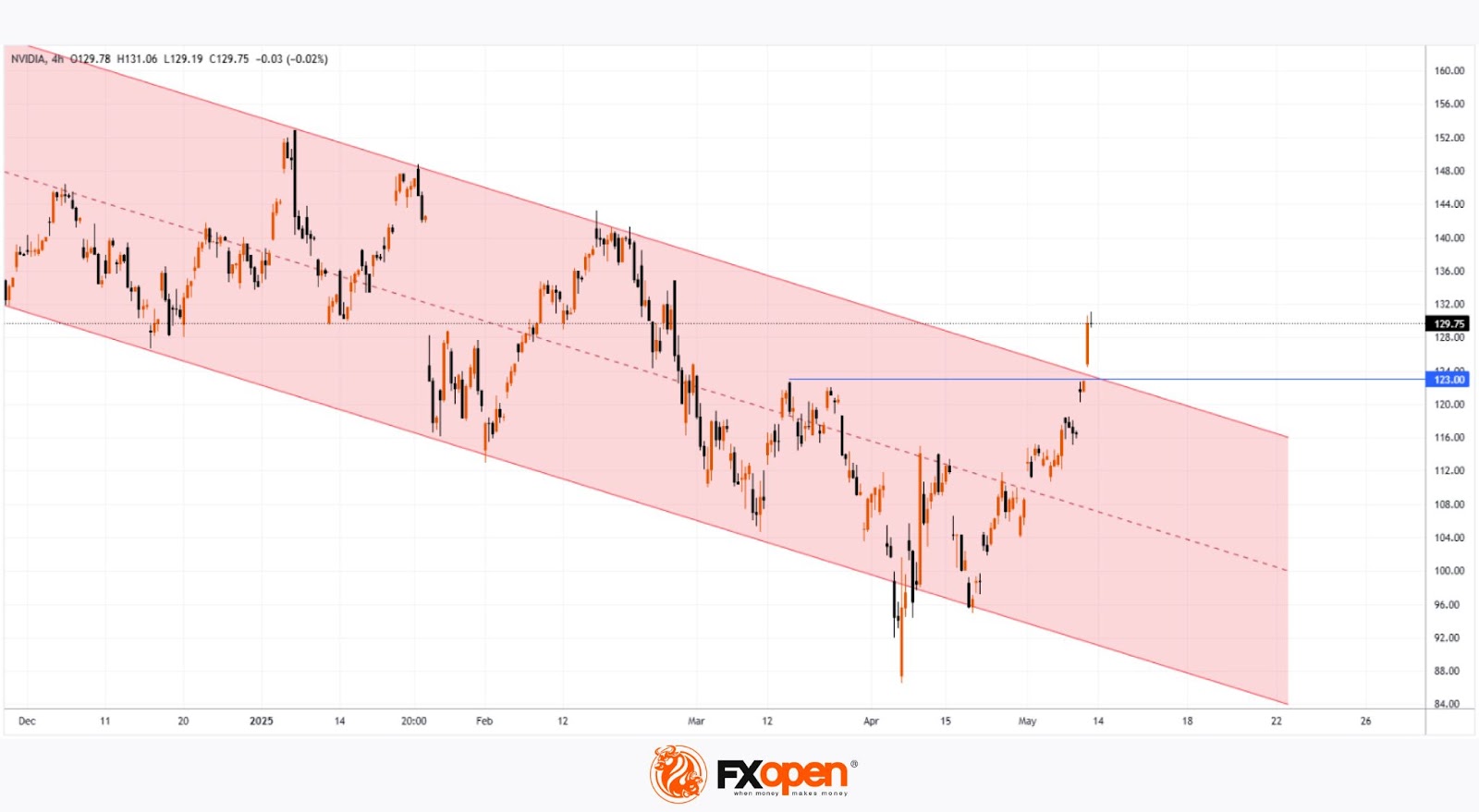 The breakout occurred near the $123 level, which had previously acted as resistance. It is therefore possible that if there is a pullback in the NVDA stock price, this level could act as support (“breakout retest” pattern), confirming the breakdown of the descending channel and strengthening the outlook for further growth.