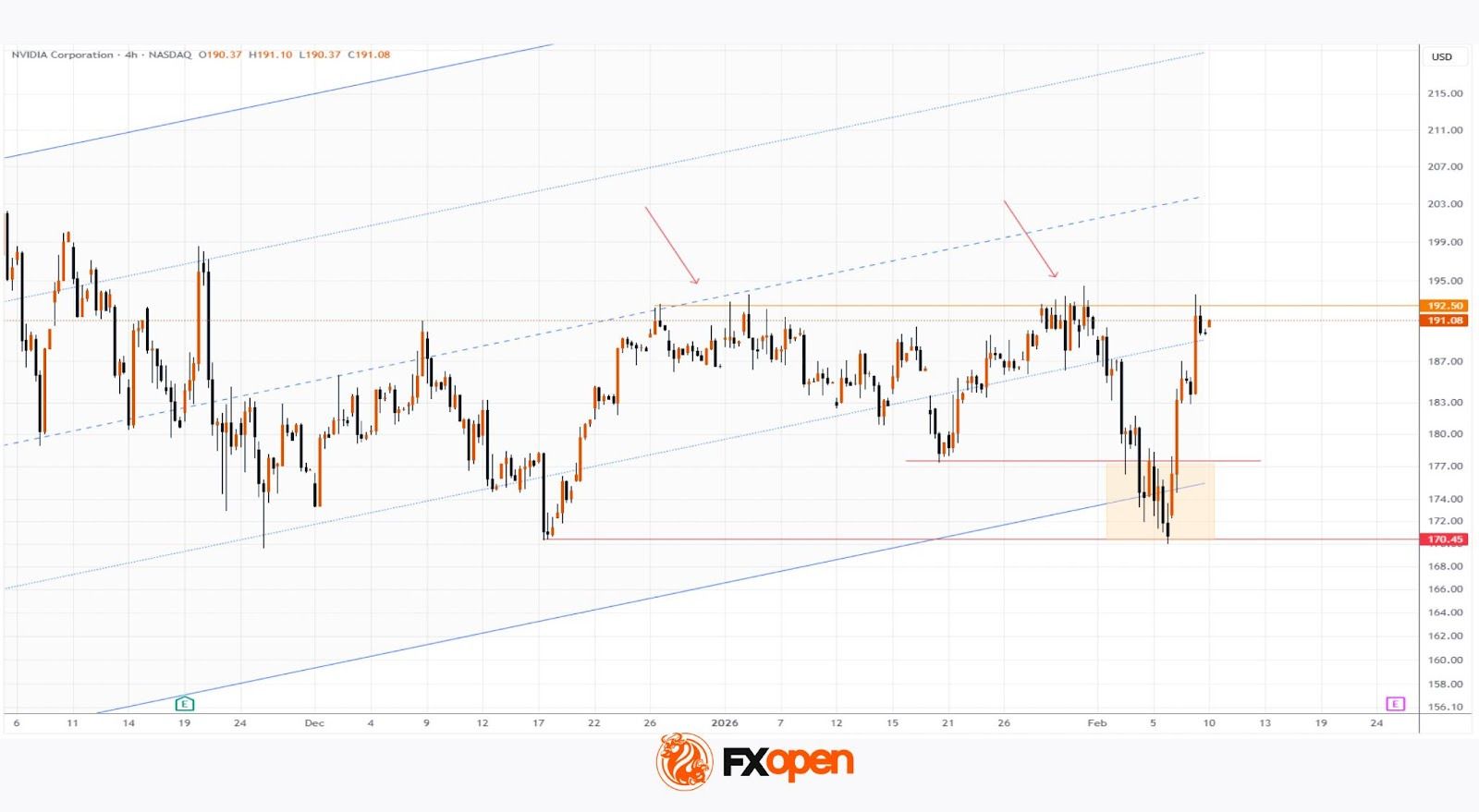 As the Nvidia (NVDA) share chart shows, during yesterday’s trading session the price advanced towards a key resistance area around $192.50, where notable peaks were formed in December 2025 and January 2026. The move was supported by several factors that boosted optimism: