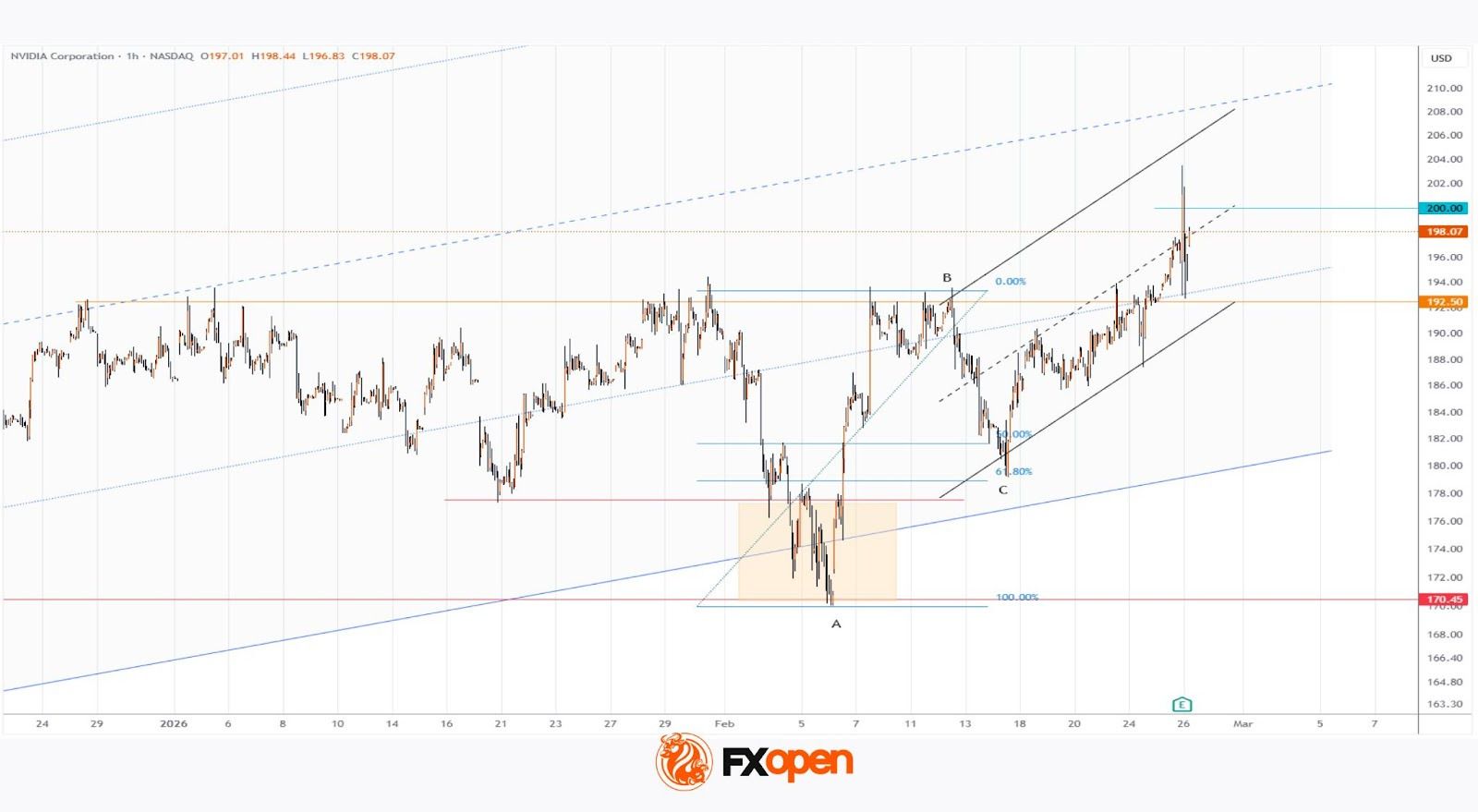 → on 17 February, it resumed its advance, supported by a short-term ascending channel (marked in black), ultimately reaching $200.