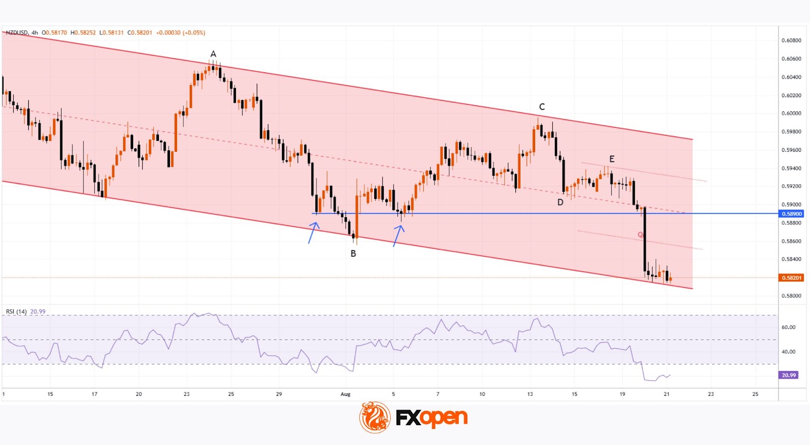 NZD/USD price action since early July has formed a downward channel (marked in red), reflecting a bearish outlook. Key observations: